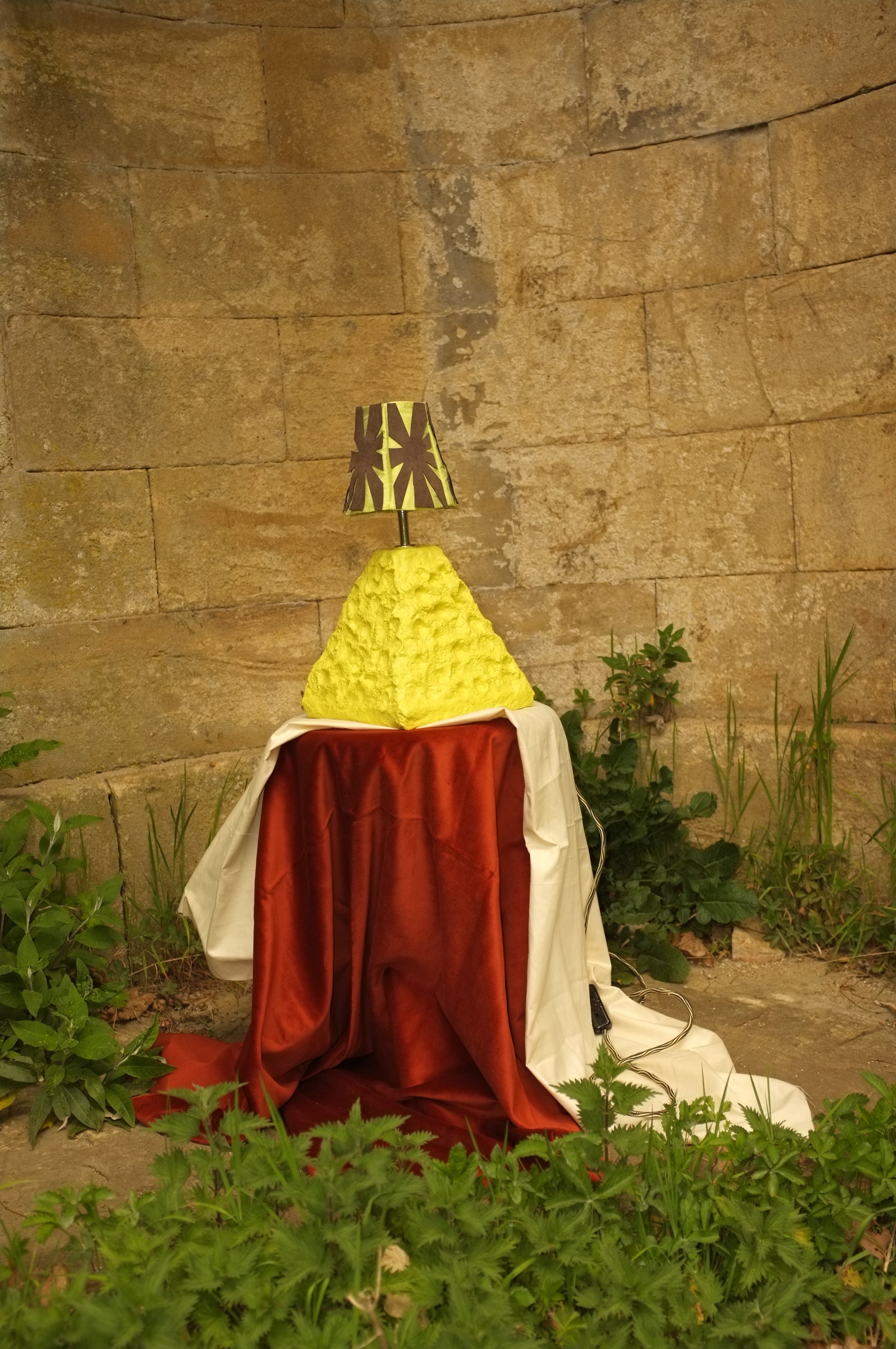 Material: Papier-mache base with hand-stitches lampshade & recycled leather applique, LED bulb included