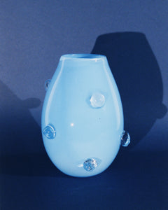 The Blue & Clear Bobble Vase is a playful, handcrafted piece by designer-maker Hannah Bax, expertly created using traditional glassblowing techniques. Its soft blue form is punctuated by clear glass bobbles, adding a tactile dimension and a sense of joyful character to its smooth, fluid silhouette.
