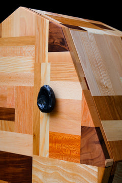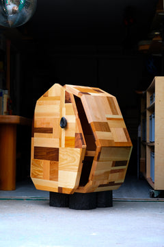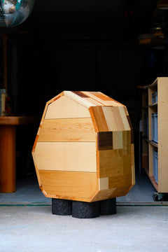 This cabinet belongs to the Patchwork collection, a series that celebrates the beauty of timber waste. Individually, these offcuts are superfluous - but collected, categorised and glued together, they take on a whole new worth and meaning as a cohesive raw material.