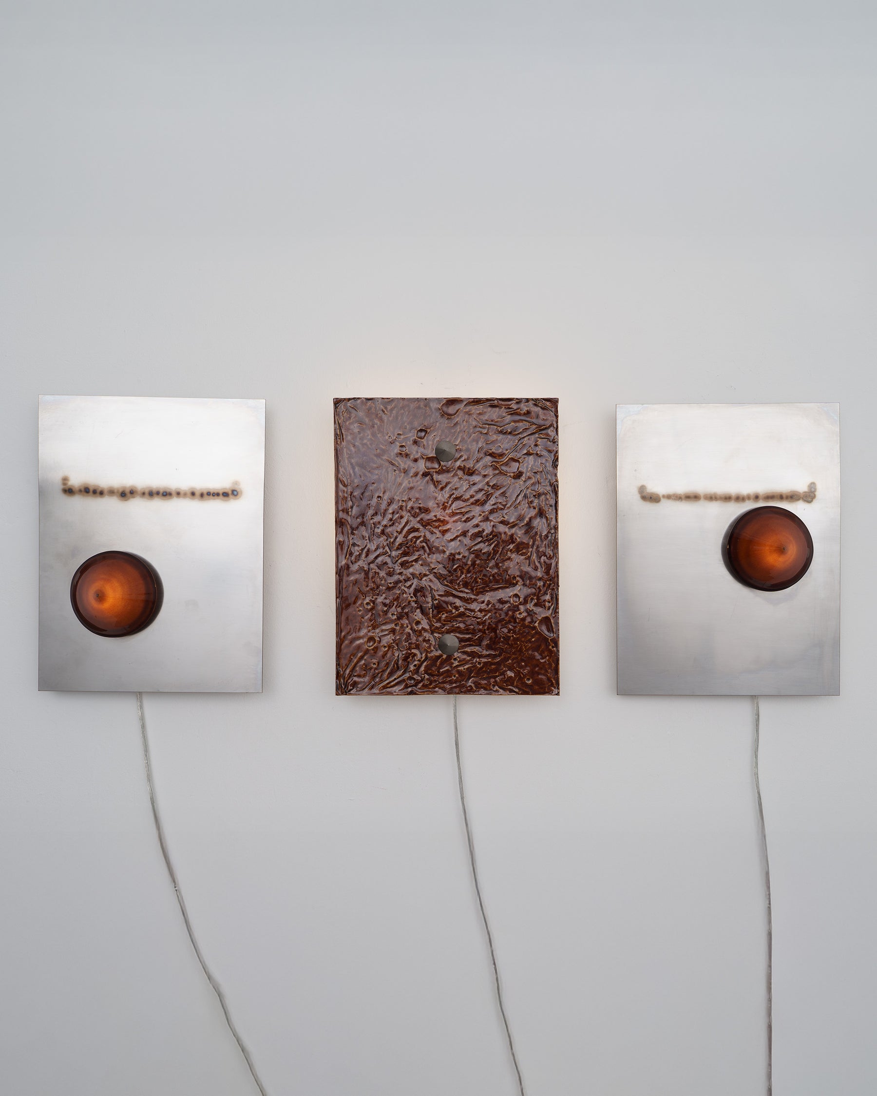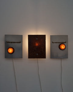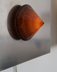 Series of dimmable wall-based sculptural lighting objects bringing ambient light to a space. The ceramic lampshades are made of glazed Parian porcelain from the island of Paros in Greece, which is translucent. The stainless steel wall hangings are tig-welded and brushed. Each lamp as well as the glazed surface and welding marks can differ slightly due to its handmade nature, as well as being made from natural materials. Limited edition of 10 each. Conic Light 3 is the lamp on the right hand side within the triptych.