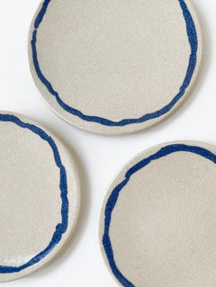 Cream stoneware with navy blue stoneware inlay, transparent glaze. Handmade and unique so may vary slightly in size and finish.
