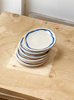 Glossy small plate with a denim border detail.