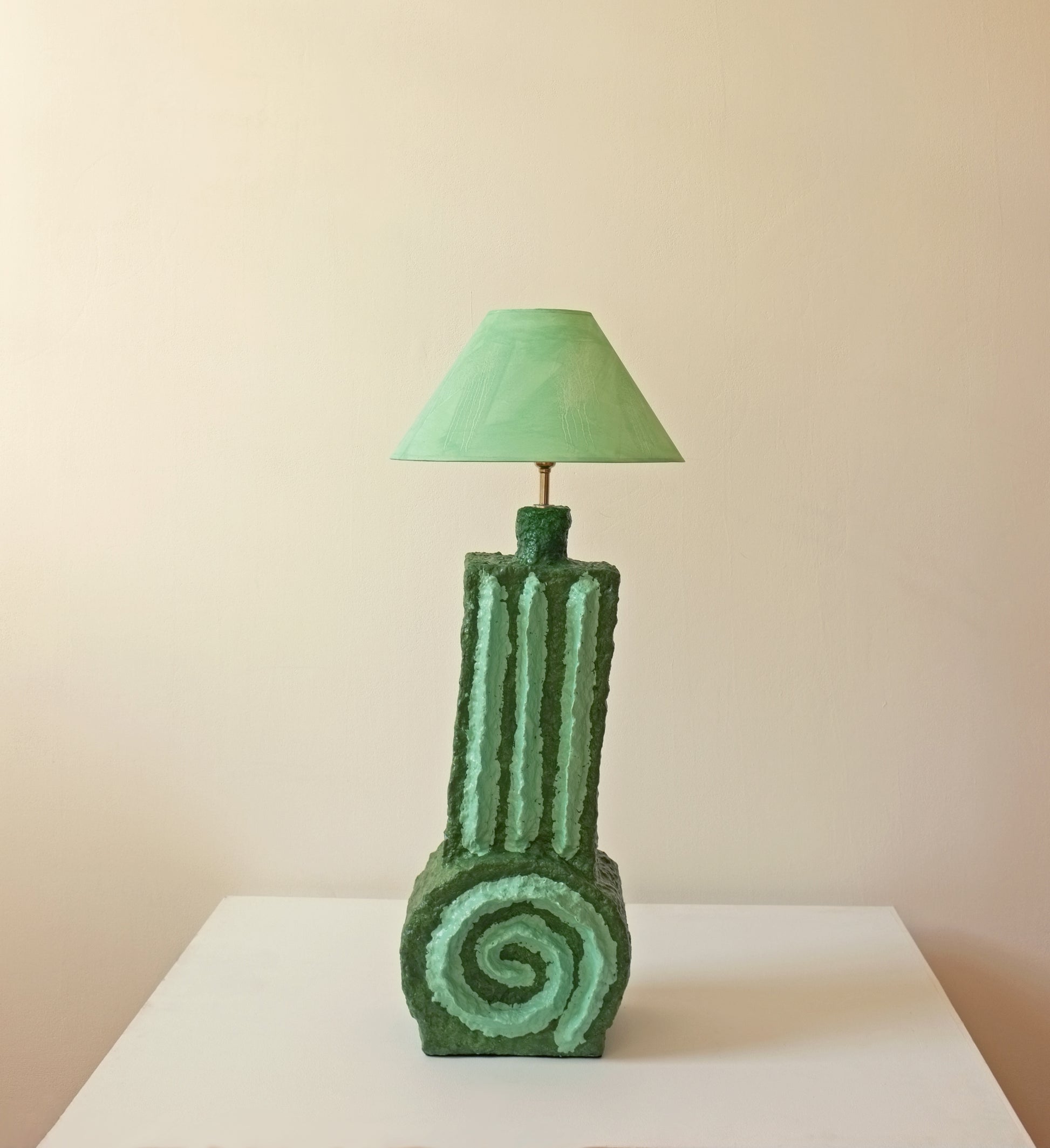 Part of a limited collection made to order. Every lamp is hand sculpted by Annie in her South London studio. She starts with building an armature from recycled card and wood. This is followed by the meticulous process of layering paper pulp over the base, adding her unique style of textural relief. Each stage of making is completed in small batches; from the processing of paper pulp, to painting and finishing bases and lamp shades.