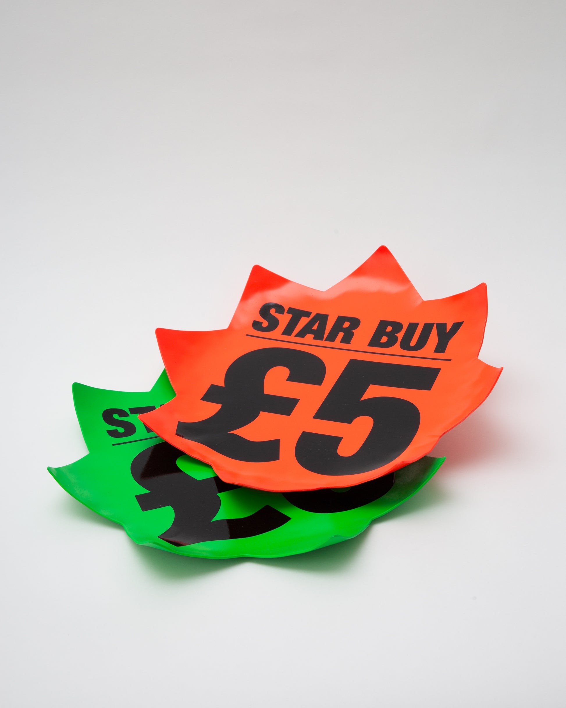 VERY OSTENTATIOUS AND GAUDY BUT STILL QUITE COOL by George Exon featured in The Car Boot Sale exhibition in London Design Festival 2025. A Fruit bowl made from laser cut aluminium, formed to have a soft curve, and painted to the iconic bright colours of the Star buy sticker!